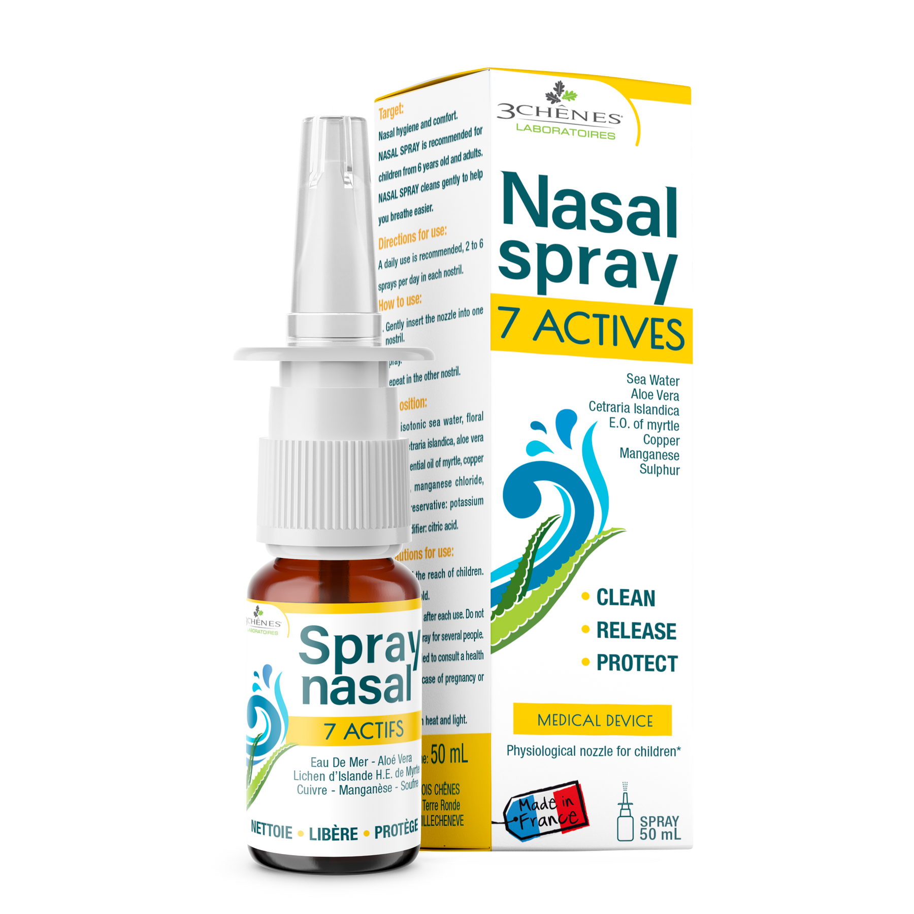 3 CHÊNES 7 Actives – nosies purškalas higienai ir apsaugai. Unikali 7 aktyvių ingredientų formulė su jūros vandeniu, islandinės kerpenos vandeniu, alavijo ekstraktu, mirtos eteriniu aliejumi bei mineralais (variu, manganu, siera) padeda švelniai drėkinti ir valyti nosies ertmes. Patogu naudoti kasdien, ypač kai nosis jautri sausam ar užterštam orui. Tinka vaikams nuo 6 metų.