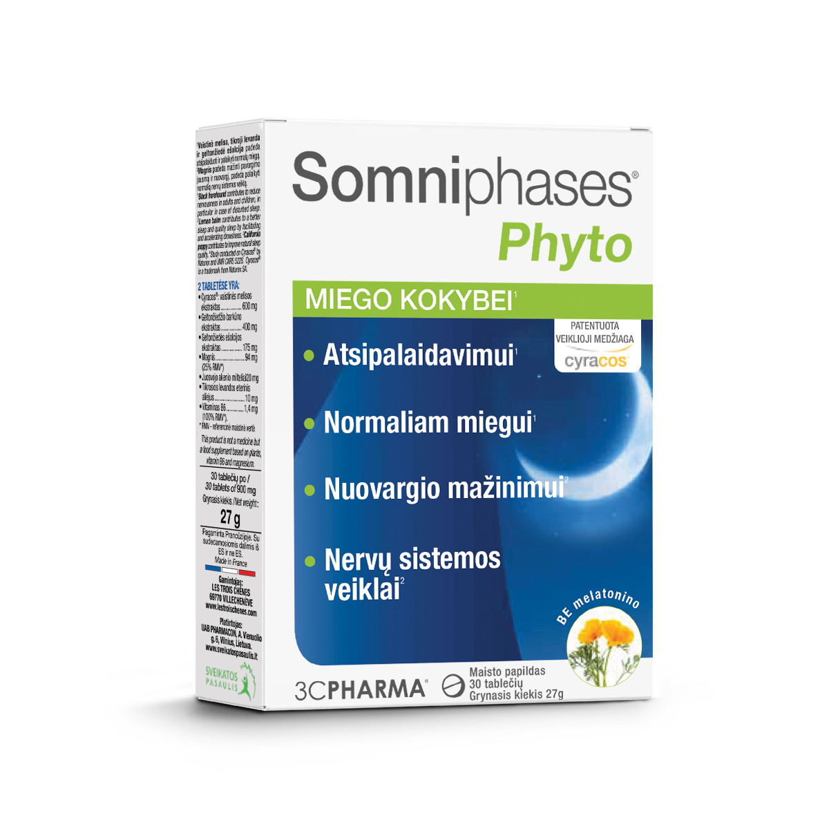 3C PHARMA Somniphases Phyto – natūralus kompleksas miegui ir poilsiui. Patentuotas Cyracos® vaistinės melisos ekstraktas, Kalifornijos aguona, levandų aliejus, magnis ir vitaminas B6 gali padėti palaikyti kokybišką miegą, atsipalaidavimą bei sumažinti nuovargį. Nesukelia pripratimo, tinkamas vartoti nuo 12 metų.
