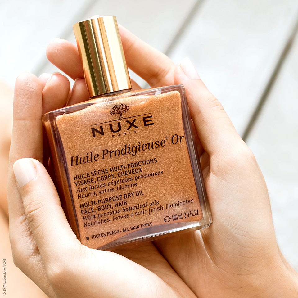 Naudokite „Huile Prodigieuse Or“ su aukso dalelėmis kūno ir plaukų priežiūrai visus metus.